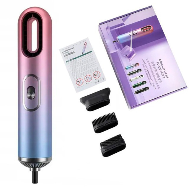 Портативний дорожній фен для волосся — це інноваційна конструкція подвійного виходу іонів, може вивільняти сині іони, проникати в пасма волосся й закривати кутикули, а також утримувати вологу, роблячи волосся природними еластичними. Багатофункціональний гребінець із гарячим повітрям усуває тьмяність і сухість волосся, оживляє пасма та робить волосся менш пухнастим і блискучим.