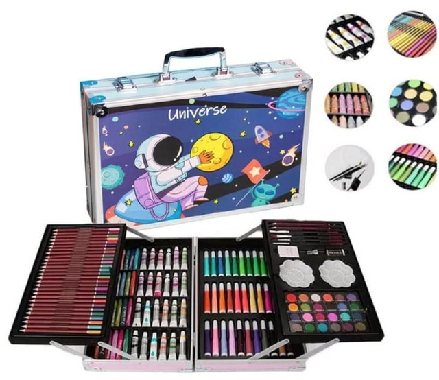 Цей набір для творчості містить 145 предметів, які забезпечать вас усім необхідним для реалізації найсміливіших художніх ідей. До комплекту входять олівці, фарби, пензлі, альбоми для ескізів та інші інструменти, які дають змогу працювати з різними техніками та матеріалами. Це ідеальний набір для художників різного віку — від дітей до дорослих.