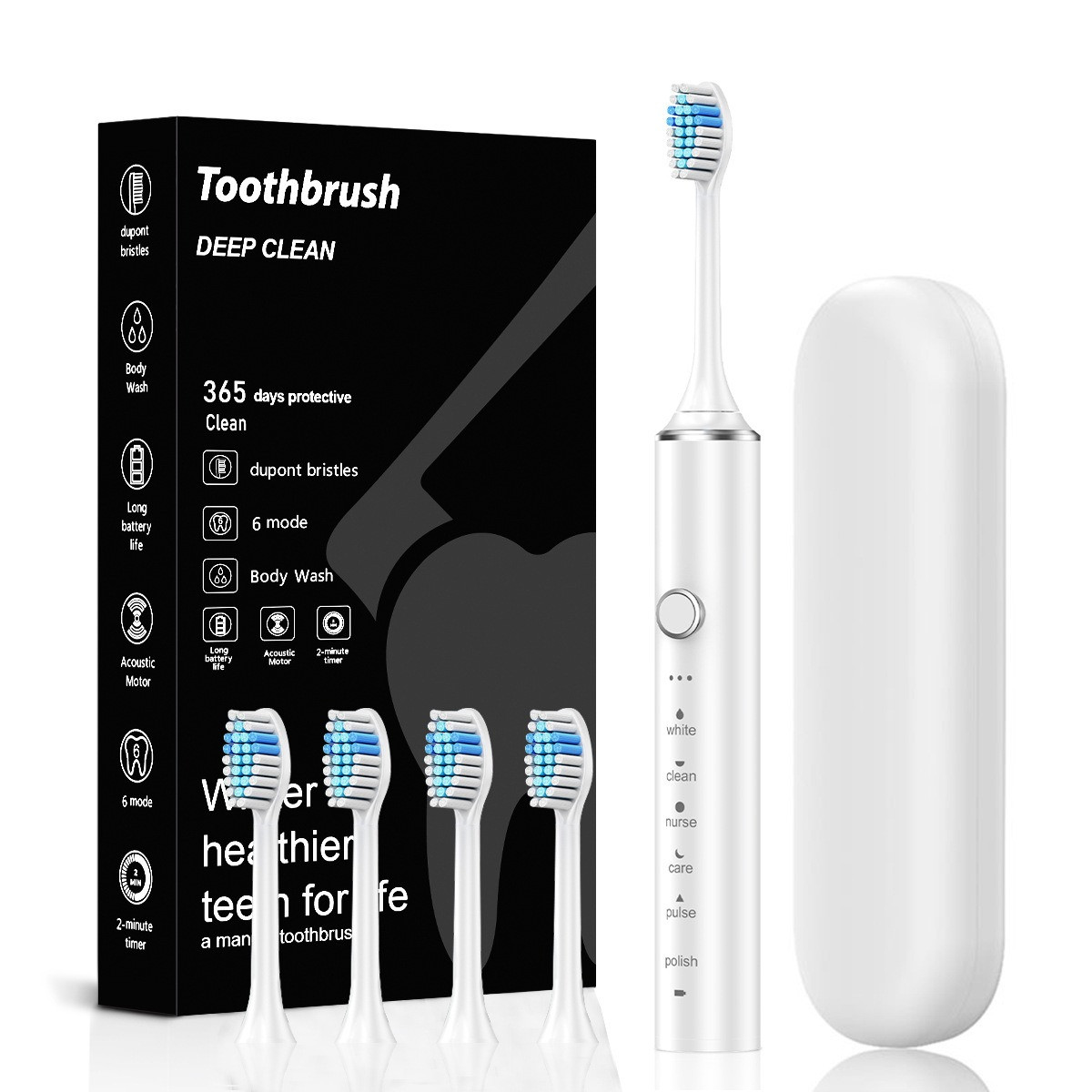 Електрична звукова зубна щітка з 6 режимами, м'яка щетина DuPont, 4 змінні насадки, кейс